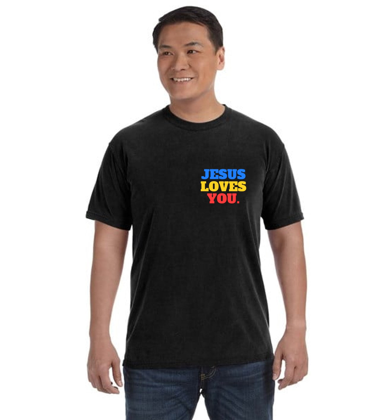 On the front, a subtle yet meaningful “Jesus Loves You” is printed on the left chest, close to the heart. The back makes a vibrant statement with a colorful “FAITH over FEAR” design, surrounded by blue, yellow, red, and green stars—symbolizing joy, hope, God’s promises, and the beauty of His creation. At the bottom, “Jesus Loves You” appears again, grounding the message in Christ’s unconditional love.