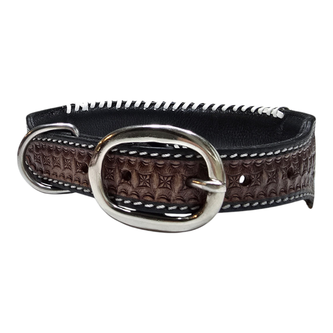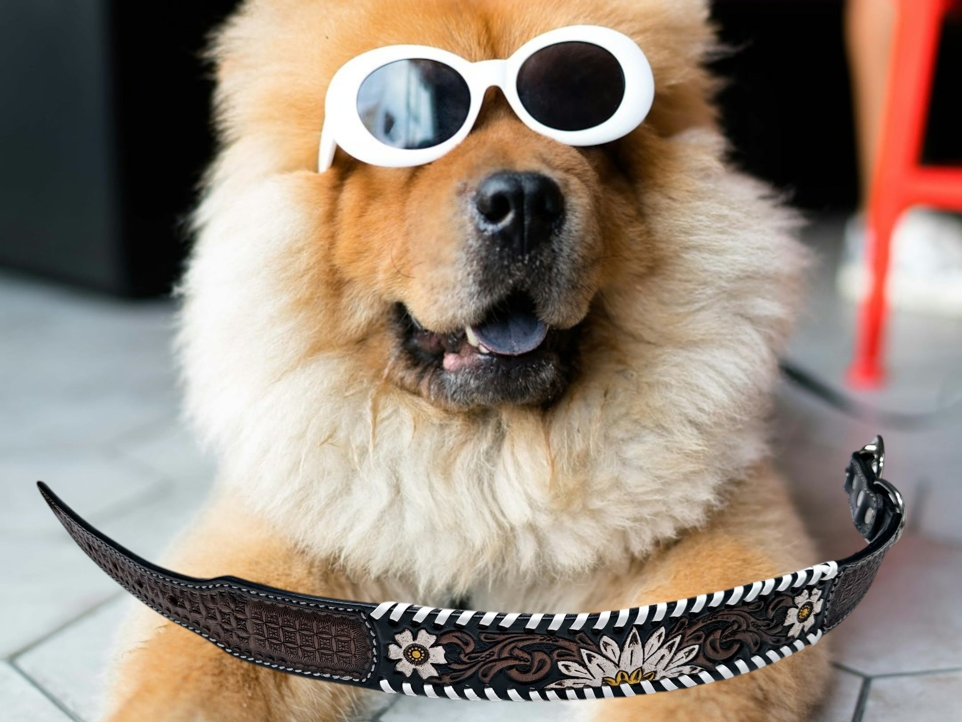 This Western Leather Dog Collar is a stylish and durable accessory designed with both comfort and functionality in mind. Measuring 20.0" in length and 1.5" in width, the collar is made from high-quality brown leather that gives it a classic, rustic appearance. It is adjustable with 5 holes. It features a beautiful sunflower and hand-tool design, intricately embossed into the leather, adding a unique western flair. The pig stitching along the edges not only enhances the collar’s visual appeal but also adds strength and resilience. The collar is reinforced with strong edge stitching for added durability and to ensure it stands up to wear and tear. Inside, the collar is lined with soft padding, providing your dog with a comfortable fit while also keeping the look rugged and stylish. Perfect for adding a touch of western charm to your pet’s wardrobe, this collar combines both practicality and fashion.