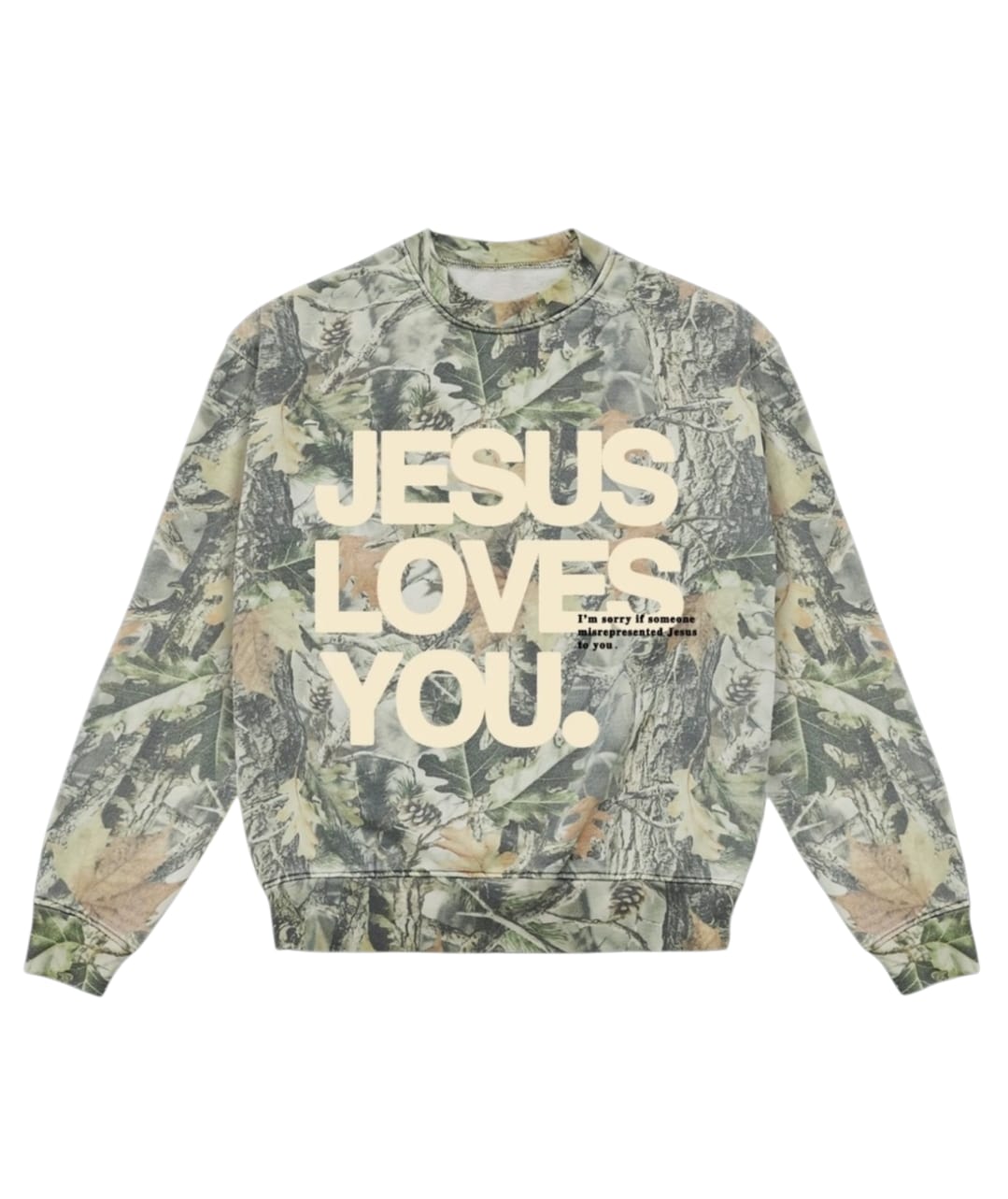 The rugged camo print pairs powerfully with the bold words Jesus Loves You, creating a strong visual reminder of the greatest truth ever spoken. Inspired by Scripture such as “We love because He first loved us” (1 John 4:19) and “Give thanks to the Lord, for He is good; His love endures forever” (Psalm 136:1), this piece reflects the unchanging, eternal love of Christ.