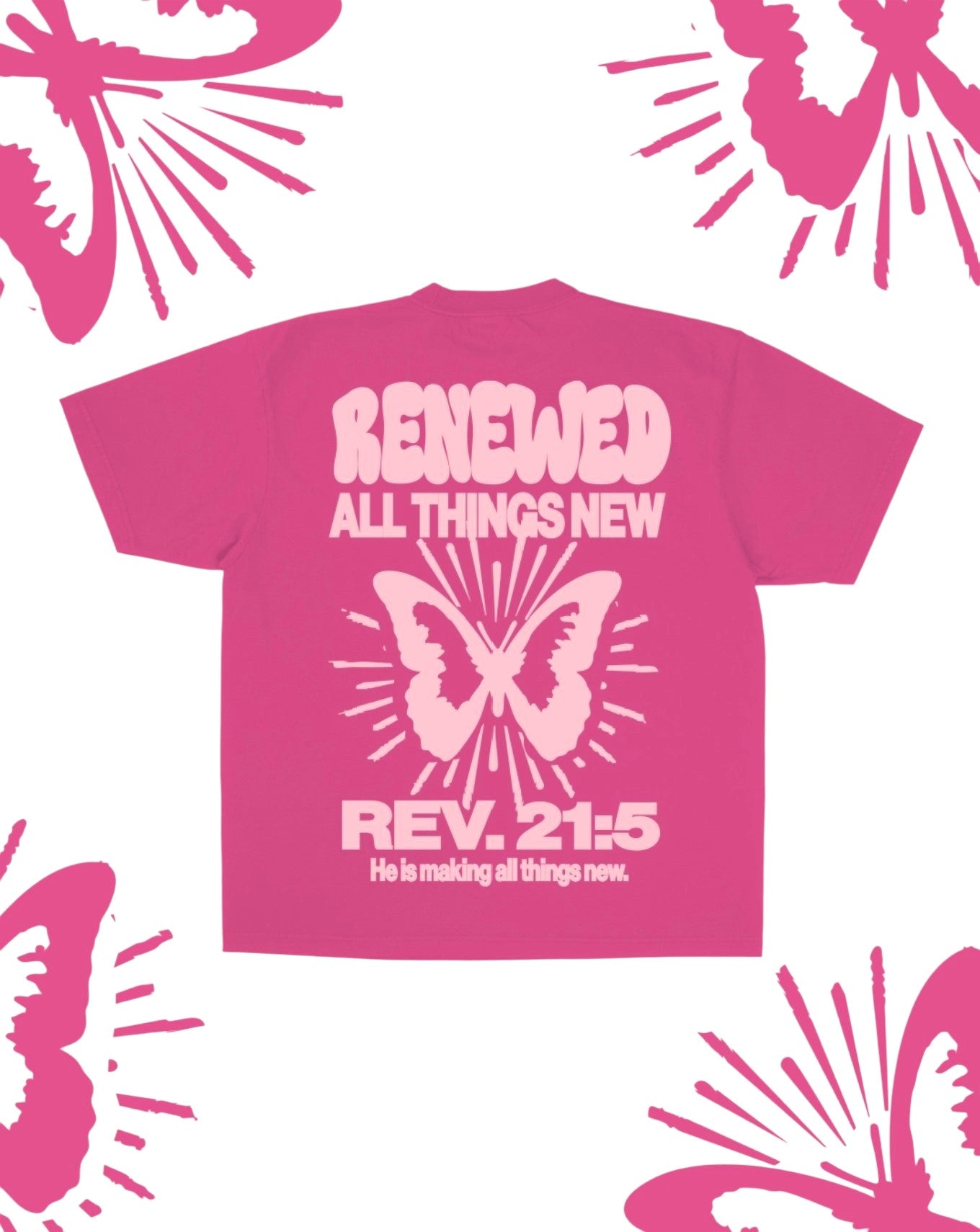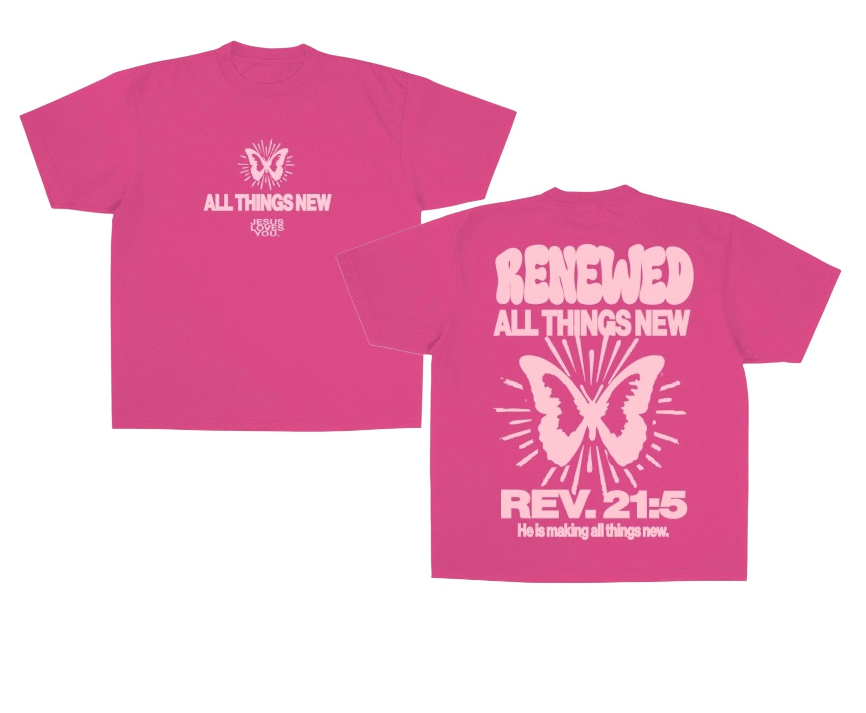 Jesus Loves You™ All Things New Christian T-Shirt – Revelation 21:5 Bible Verse Graphic Tee | Pink Unisex Faith Shirt