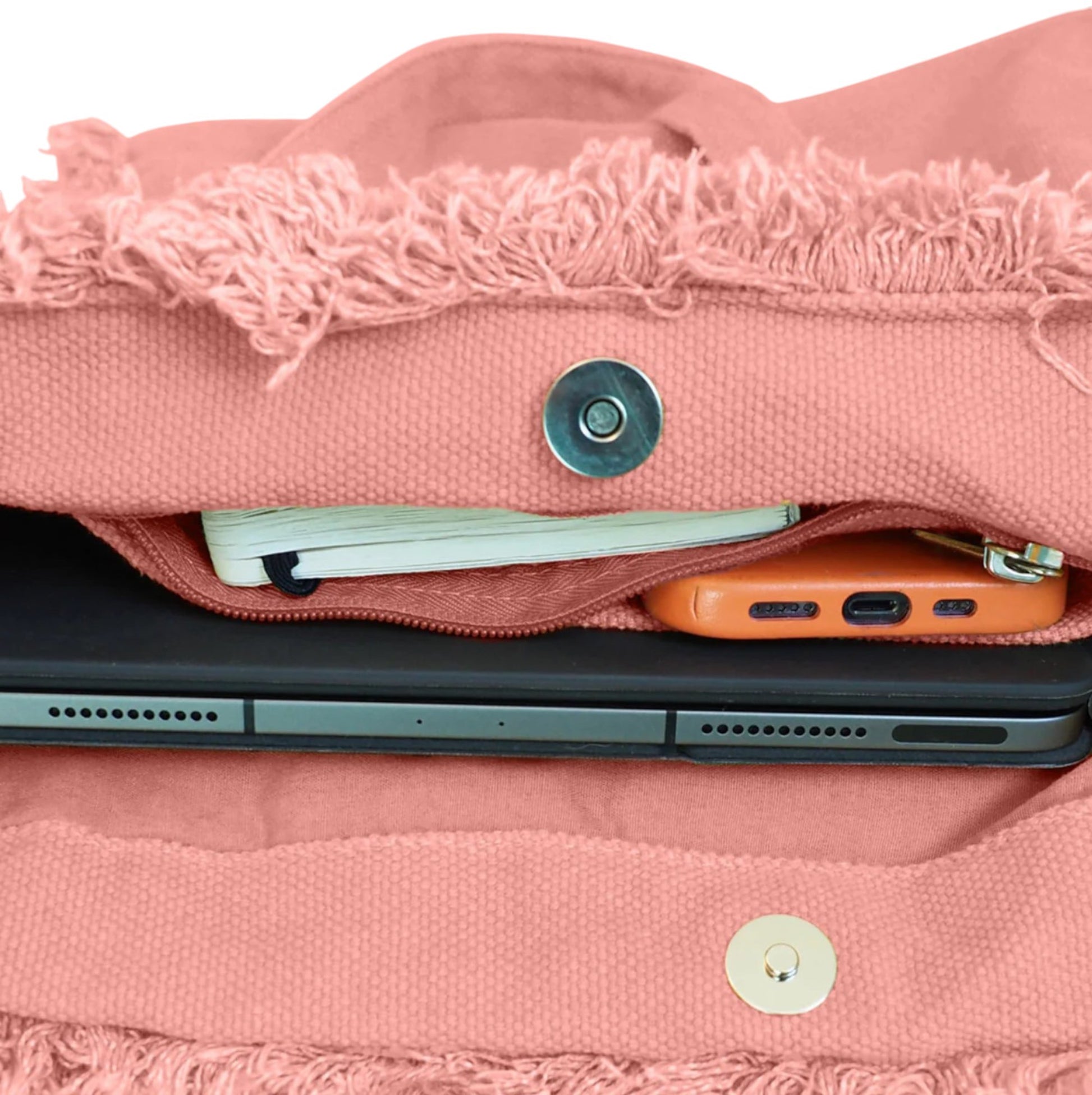 This durable fringed canvas Love tote bag lets you carry a message of faith with you wherever you go! A removable bottom plate adds structure and shape. This pretty + practical tote bag includes two inner pockets—one securely zippered, and one open for easy access to your phone and keys.