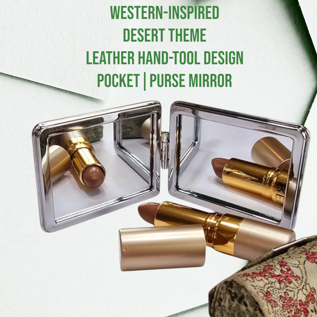 This compact mini handheld makeup mirror is a perfect fusion of rugged charm and stylish elegance. Rectangular in shape, it features double-sided compact mirrors: one side with a regular reflection for everyday use and the other with magnification, offering precise detail for makeup application. The western-inspired look paired with a desert-themed leather hand-tool design brings a touch of the outdoors and a sense of adventure to this functional beauty accessory. The splash of color on the leather exterior adds a vibrant and artistic twist, making it as much a statement piece as it is a practical tool.