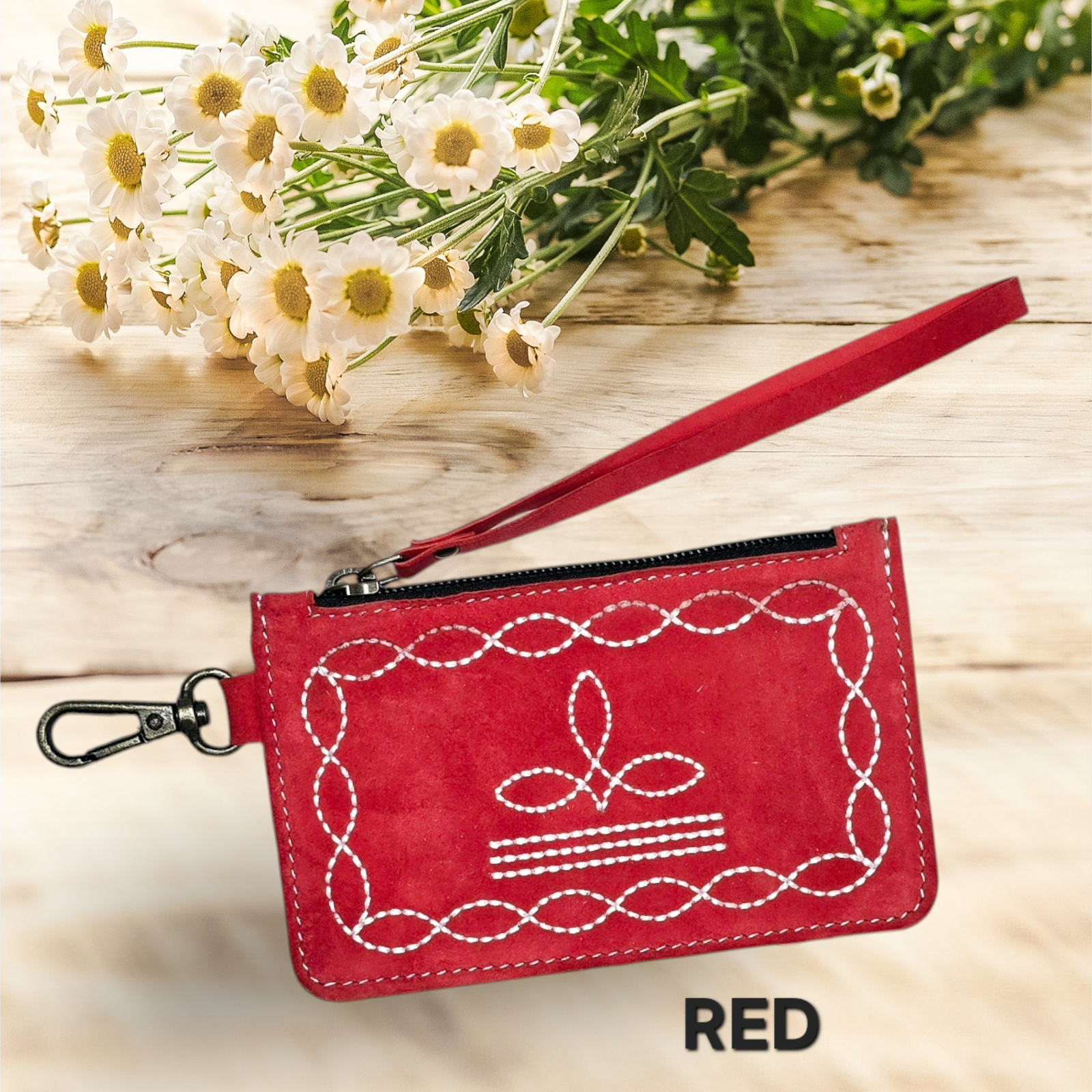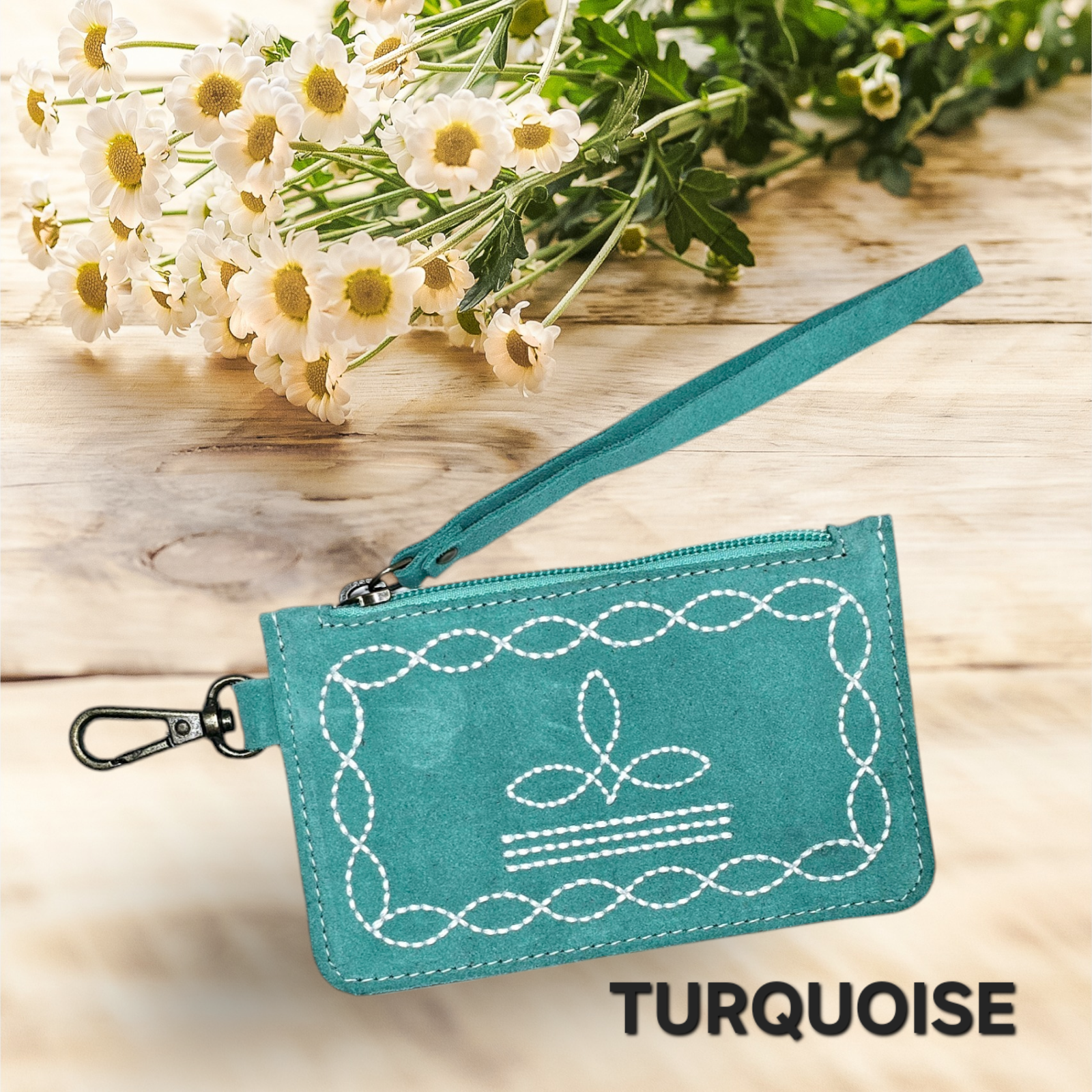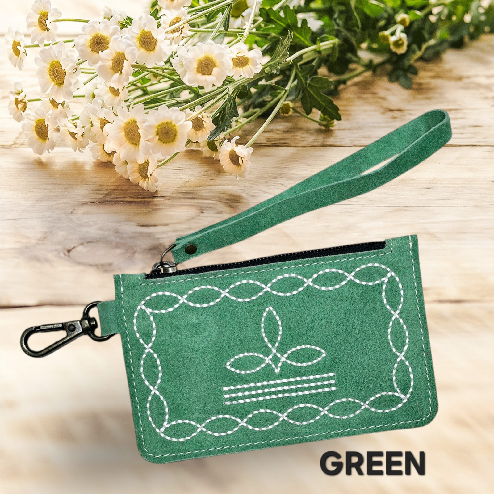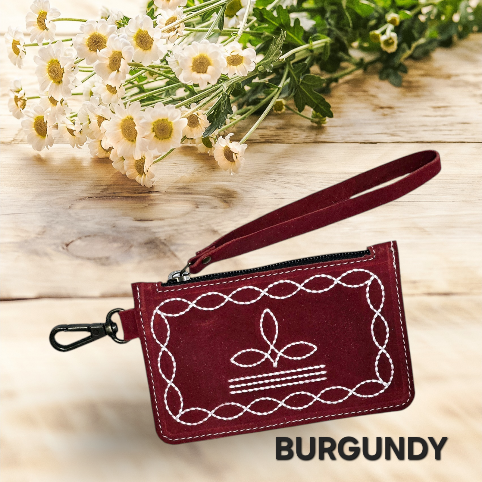 This genuine leather slim, compact wristlet wallet/purse is a perfect blend of style, convenience, and practicality, designed for those who prefer carrying just the essentials. The front showcases a stunning western design embroidery stitching, giving it a rustic and trendy flair. With a secure zip closure, this purse safely holds your money or coins, while the back features a pocket for your ID or credit cards, keeping everything organized and within reach. A leather wristlet strap allows you to wear it comfortably on your wrist, while a solid metal clip hook offers versatile options for clipping the wallet to your pants, bag, or carrying it separately inside your purse. Ideal for a night out, this compact and fashionable accessory ensures you carry only what you need without compromising on style or convenience.